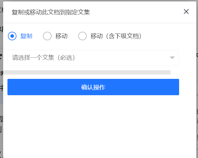 如果你需要将某个文档复制或移动到其他文集,可以在文档的修改页面进行操作,具体路径为: 鼠标悬浮页面顶部菜单栏的【文档】,选择「复制/移动文档」:  然后在弹出框中选择需要操作的类型,选择目标文集,点击「确认操作」按钮即可。
