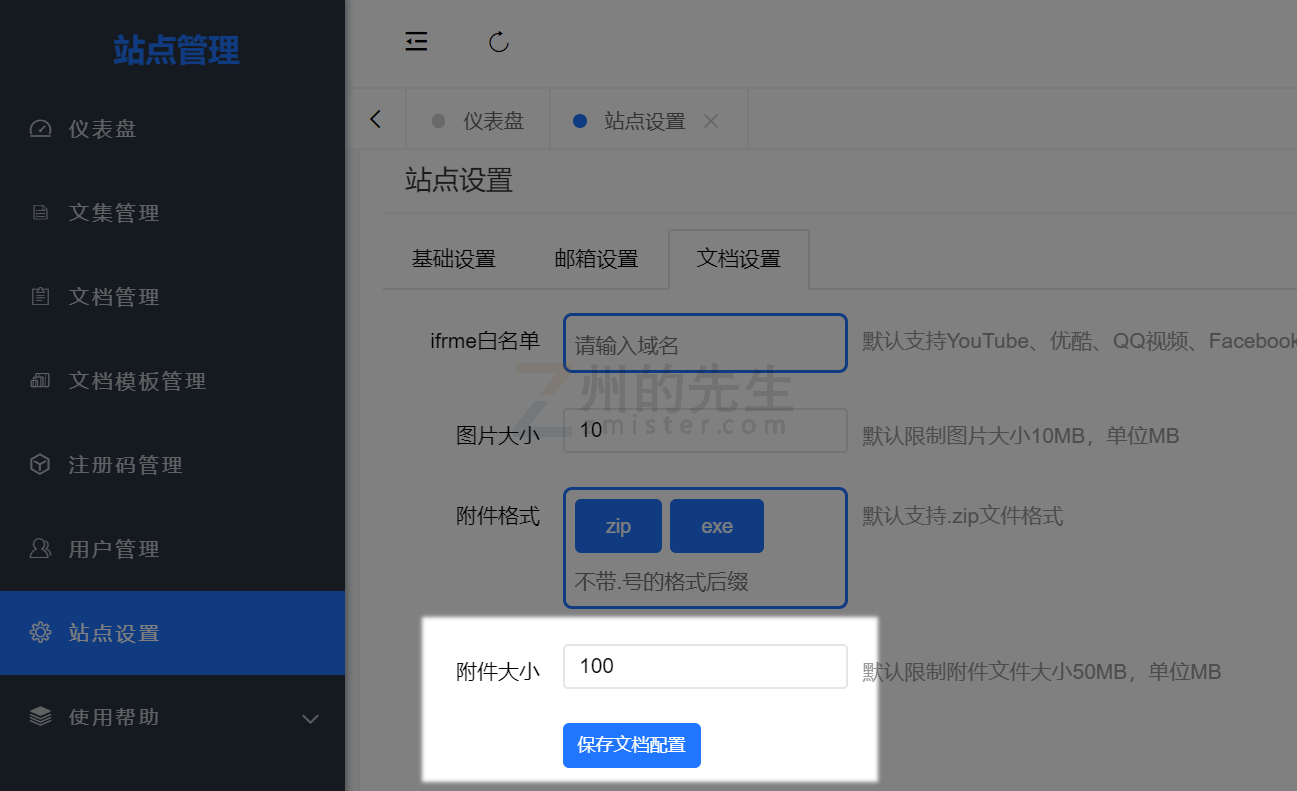 >d 如果使用了 Nginx 等工具,请确保此类工具的「最大请求大小」值大于或等于附件的大小限制值。 ## 图片上传大小限制 觅思文档的图片上传默认限制为 10MB。 如果你需要设置为其他的大小,可以前往【站点管理】-->【站点设置】页面 在【文档设置】的[图片大小]输入框中,输入期望值保存即可:  ## 附件上传大小限制 觅思文档的附件上传默认限制为 50MB。 如果你需要设置为其他的大小,可以前往【站点管理】-->【站点设置】页面 在【文档设置】的[附件大小]输入框中,输入期望值保存即可: