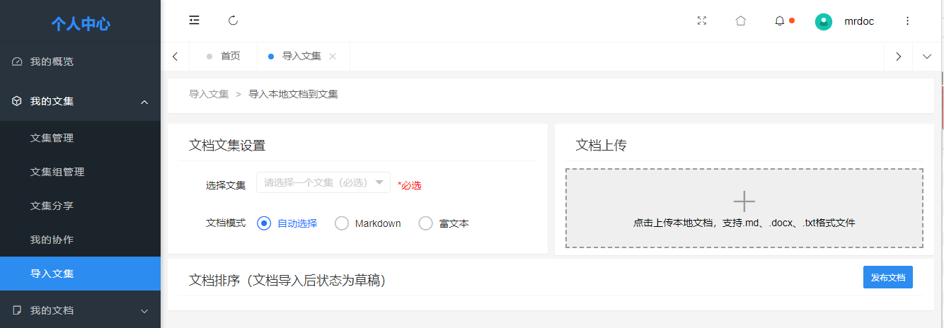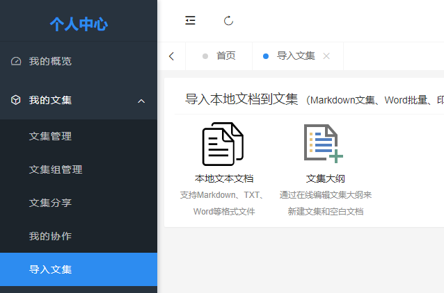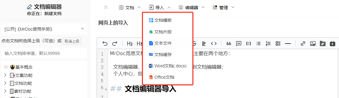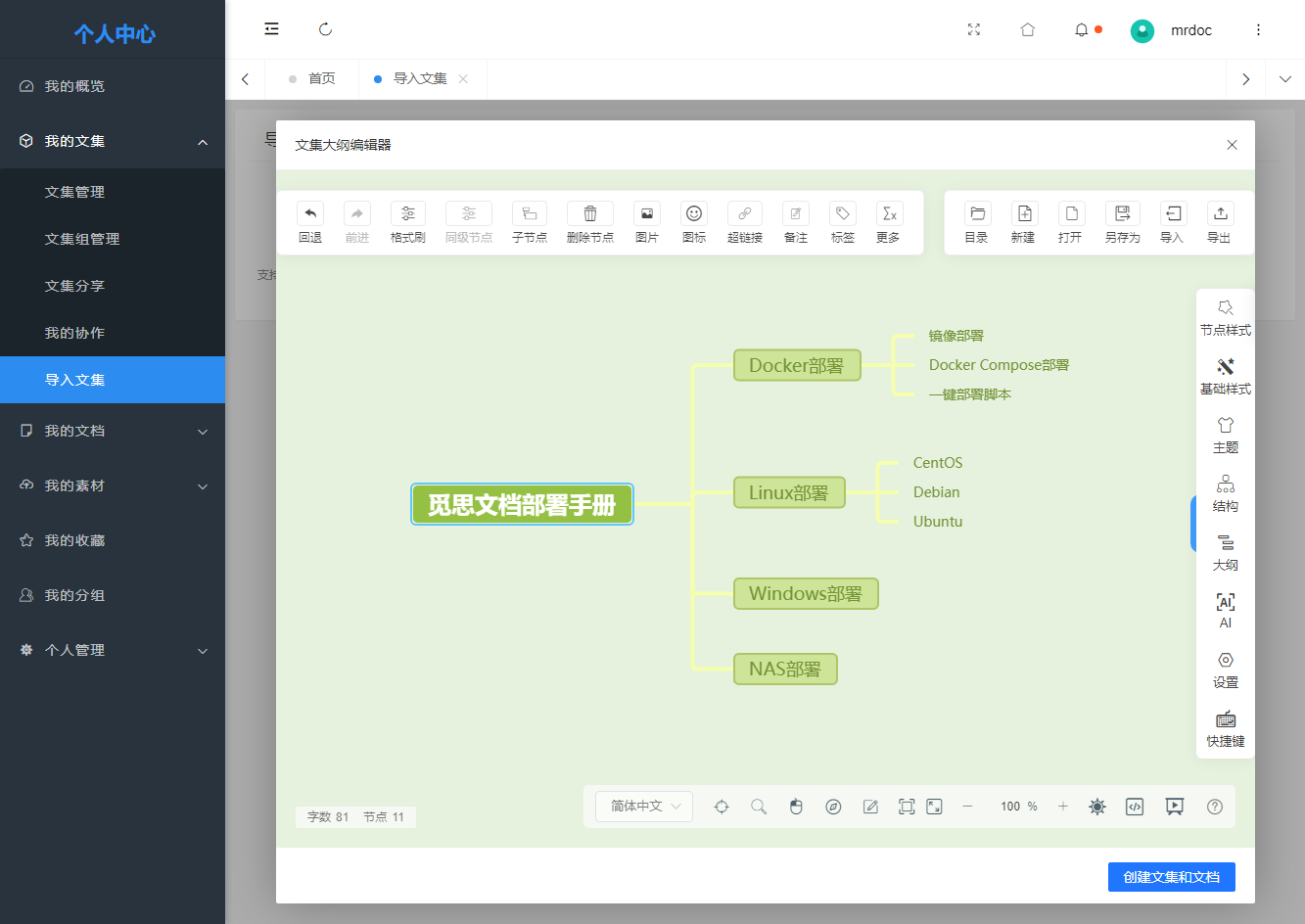 MrDoc觅思文档在 Web 网页端的导入主要在两个地方: - 文档编辑器,主要是将单一文档导入到文档编辑器; - 个人中心,批量导入 ## 1. 文档编辑器导入 进入「新建文档」页面,鼠标悬浮在顶部导航栏的「导入」菜单上,会显示支持导入的文档类型,选择需要导入的文档类型后,在本地文件选择框里面选择需要导入的文件,等待后台上传转换即可。 目前支持: - 文本文档(Markdown、Text 等)、 - .docx格式的Word文档 - 各类 Office 文档  ## 2. 个人中心导入 个人中心支持以下导入方式: - 本地文档导入 - 文集大纲导入 - Word文集导入 入口为:「个人中心」-「文集管理」-「导入文集」  ### 2.1 本地文档导入 此导入方式支持批量将本地Markdown、text和docx格式的Word文件导入到指定文集。  导入文档后点击「发布文档」按钮即可。 ### 2.2 文集大纲导入 文集大纲导入可以便捷地通过可视化思维导图编辑器创建一个预设了文档结构的文集,思维导图的结构即是文集内文档的结构,一级节点是文集名称、其余子节点都是层级的文档。  编辑好文集结构后,点击「创建文集和文档」按钮即可。 ### 2.3 Word 文集导入 觅思文档支持包含规范标题样式的Word文档直接导入为拆分好文档的文集。 - 可选择导入为 markdown 文档或富文本 - 最多支持3个层级的标题格式 - 最多只解析到“标题三”的标题样式 - 可以只包含单个标题样式。