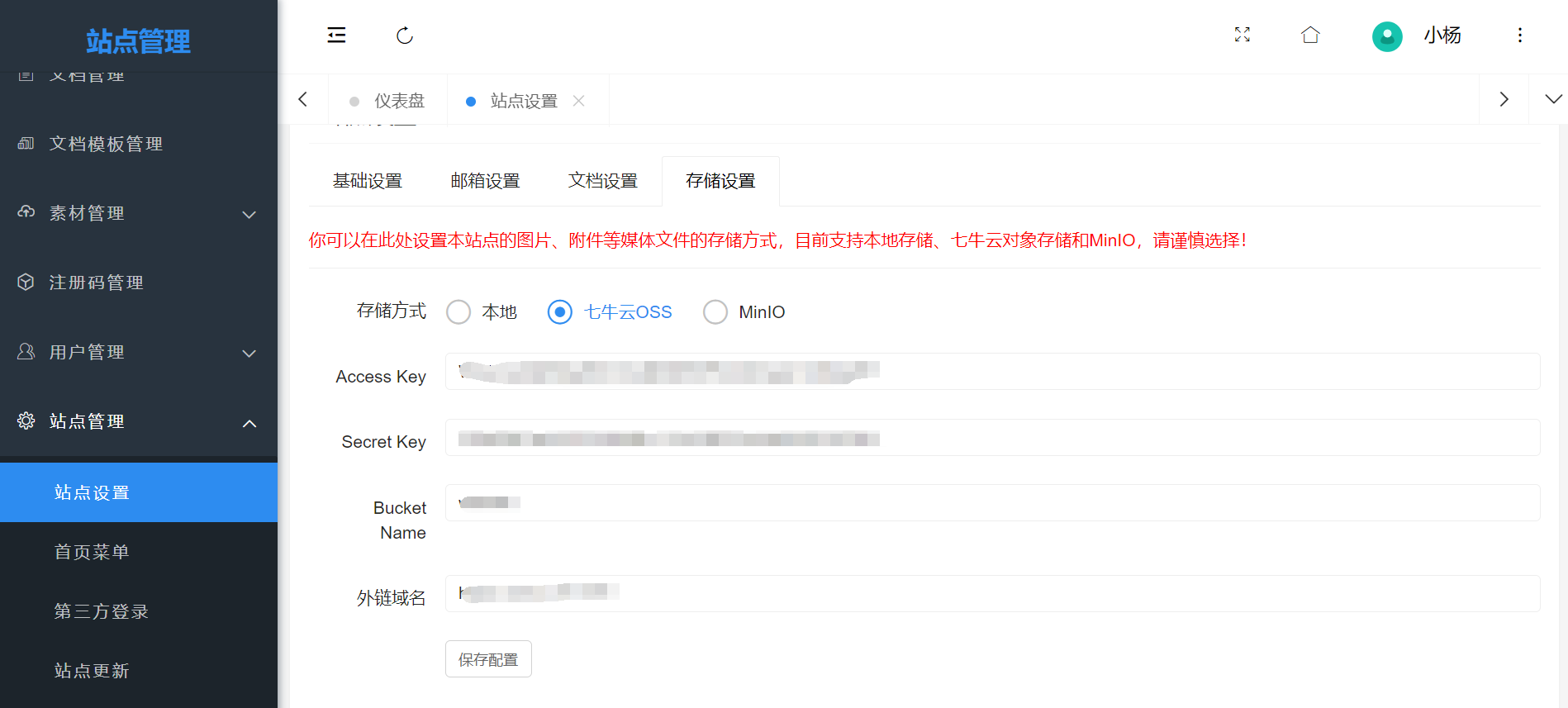 配置 七牛云OSS 需要如下 4 个配置信息,他们分别是: - Access Key:七牛云的Access Key - Secret Key:七牛云的Secret Key - Bucket Name:七牛云存储桶的名称 - 外链域名:七牛云后台为存储桶配置的外链域名