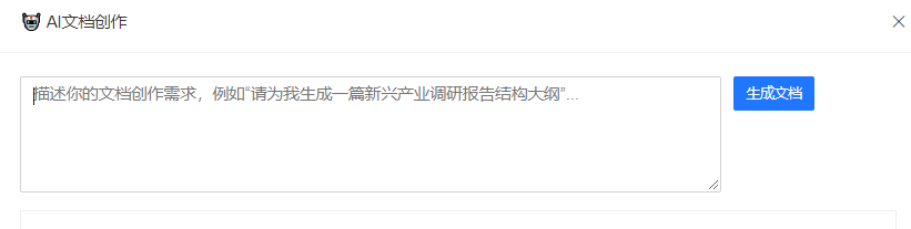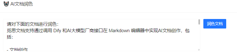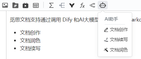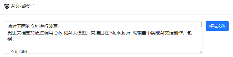 觅思文档支持通过调用 Dify 和AI大模型厂商接口在 Markdown 编辑器中实现AI文档创作,包括: - 文档创作 - 文档润色 - 文档续写 ## 配置 AI 接口 你可以选择「AI文档创作」的接口来源为Dify或自定义。 如果选择 Dify,那么需要在「Dify配置」中填写好Dify应用的「文本生成 API 密钥」  如果选择自定义,那么需要在「AI模型供应商」中添加好「AI模型」  ## 使用 AI 文档创作 >i 目前「AI文档创作」功能仅支持 Editormd编辑器 在文档编辑页面,鼠标悬浮在工具栏的机器人图标上,会显示「AI助手」的 3 个功能按钮:  ### 文档创作 直接输入提示词,让AI进行输入,然后点击「插入编辑器」即可将AI输出的内容插入到编辑器中。  ### 文档续写 点击「文档续写」,会自动将编辑器现存的内容添加到文本输入框里面,并提示AI对文档进行续写。  ### 文档润色 点击「文档续写」,如果选择了编辑器中的内容,会自动将所选的内容添加到文本输入框里面,并提示AI对文档进行润色。 如果没有选择编辑器的内容,则会自动将编辑器现存的内容添加到文本输入框里面,并提示AI对文档进行润色。
