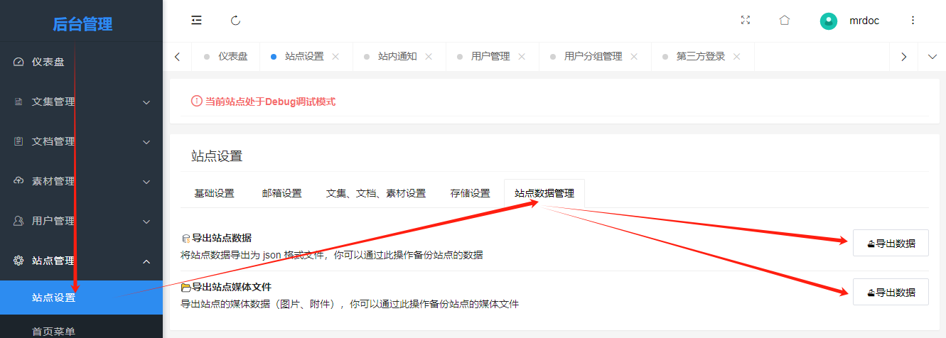 >i 如果你需要在服务器上进行数据导出操作,请移步:https://doc.mrdoc.pro/doc/45787/ MrDoc觅思文档的站点数据主要分为两类: - 数据库数据,包含创建的文集、文档、用户、素材记录等; - 媒体文件数据,包含上传的图片、附件等数据; 你可以在后台管理-站点设置-站点数据管理页面中对上述数据进行导出操作,将上述数据下载至本地。