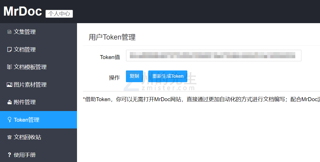 ## 获取用户 Token 你可以在 MrDoc 的【个人中心】-->【Token 管理】页面生成或获取你的用户 token:  用户 token api 的所有接口都需要在URL中携带用户 token 参数进行请求。
